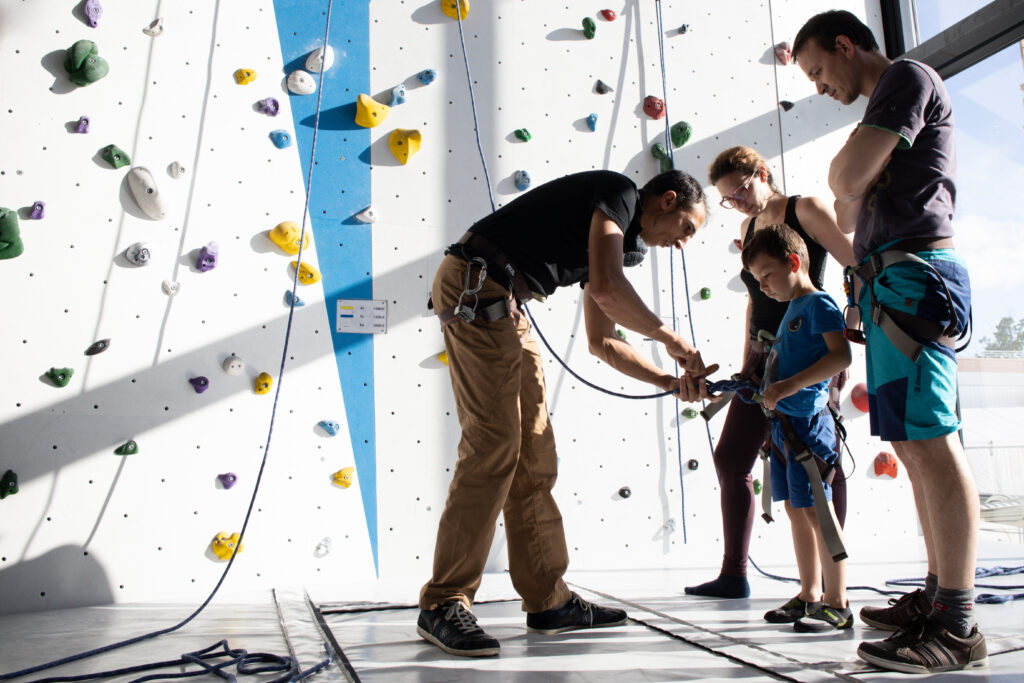 Partagez un moment complice avec vos enfants. Les parents apprennent à assurer pendant que les enfants grimpent sous la supervision d’un moniteur.